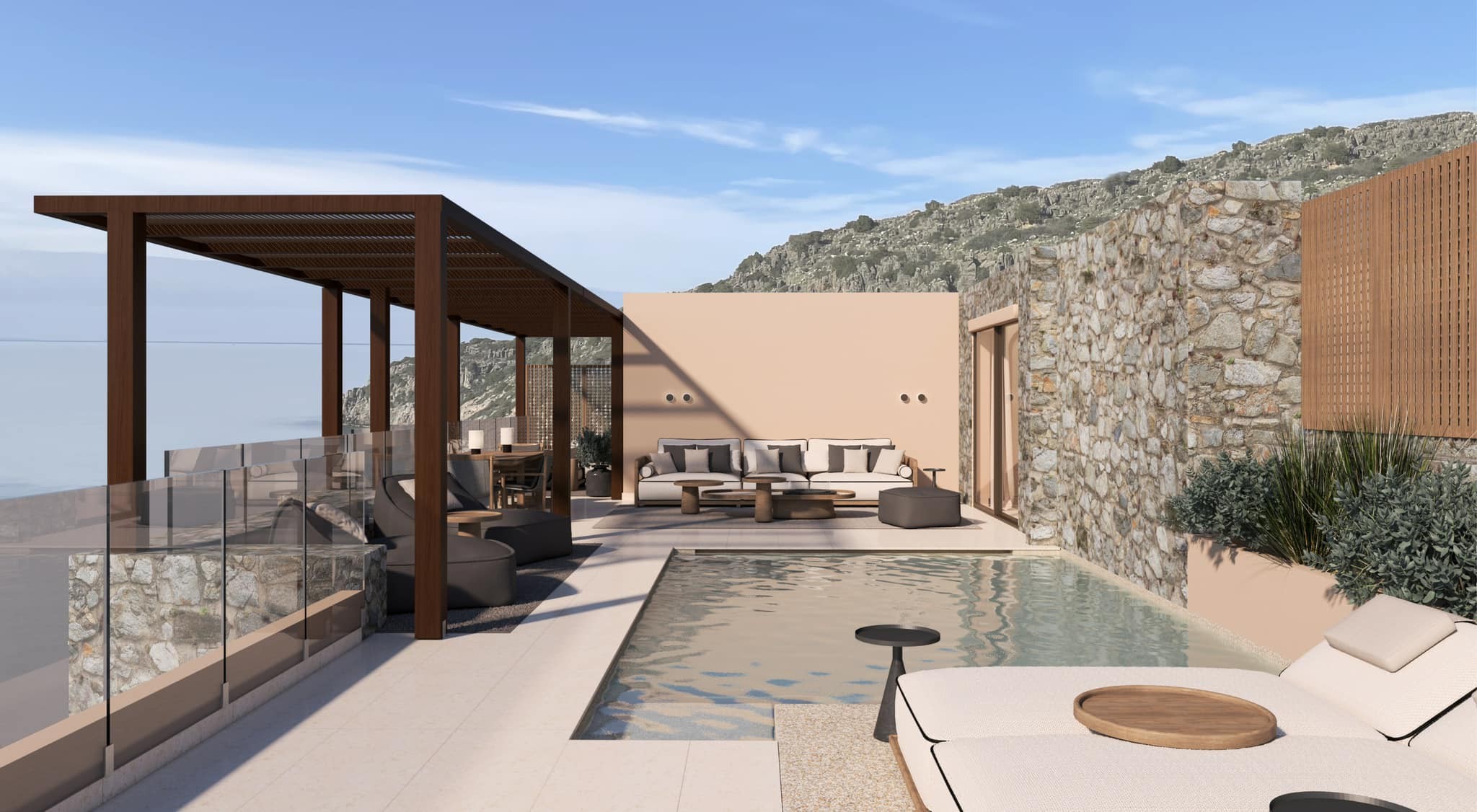 suite 1 bedroom sea view with private pool (skats uz jūru, guļamistaba, viesistaba ar durvīm, terase, king size gulta, papildu gulta – dīvāns, baseins ar jūras ūdeni (22 m2), maks. 2+2 vai 3 cilv., iekštelpas 65 m2, ārtelpas 60 m2);